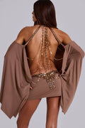 Elevate your look with the Talia Embellished Mini Dress — a brown open-back mini featuring kimono-style split sleeves, embroidered butterfly detailing, and delicate chain accents. Soft polyester-elastane fabric and sparkling sequin and glass trims create effortless elegance with every step.